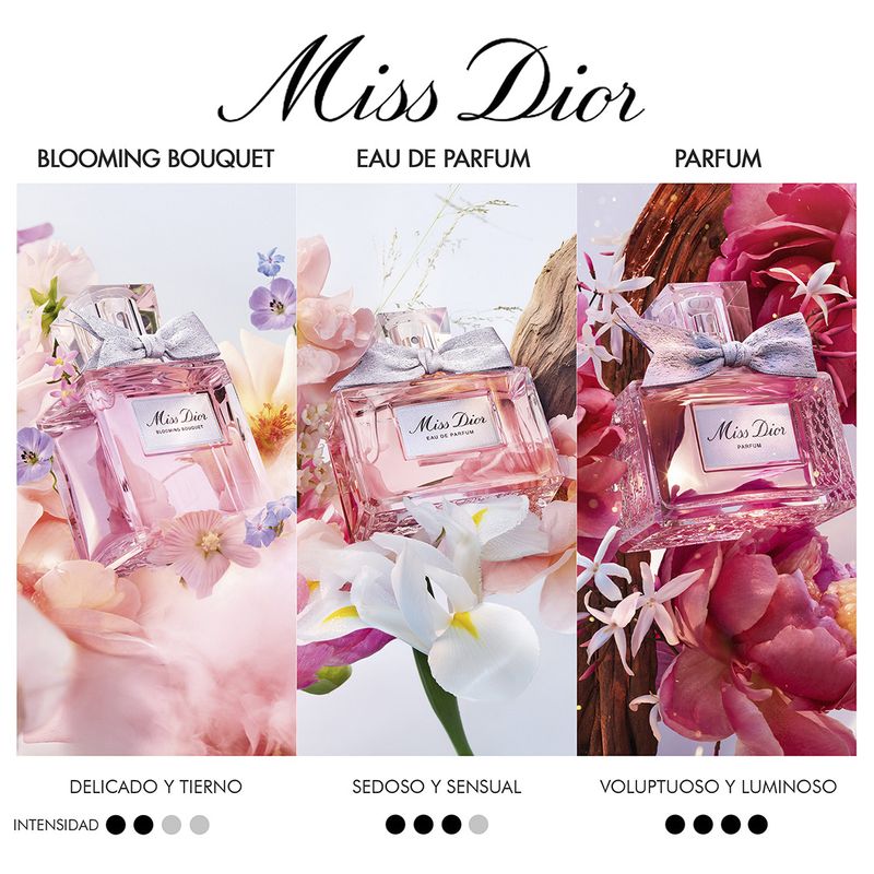 "Todos nuestros sentidos se despiertan con la sensualidad del bouquet floral de la nueva eau de parfum Miss Dior. Celebra las rosas aterciopeladas y carnales, acentuadas por un muguete fresco y una peonía picante, envueltas con un iris empolvado".